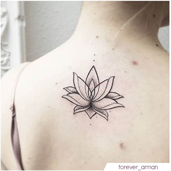 .Il fiore di loto può essere tatuato in qualsiasi parte del corpo, nonostante le donne preferiscono la parte bassa della schiena e il dietro della spalla. Loto di mandala, piccolo loto, nello stile di domatok."